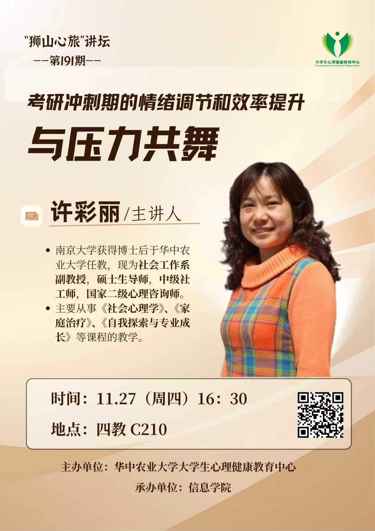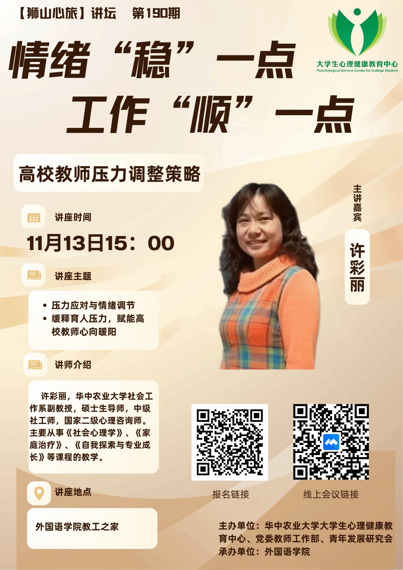 情绪“稳”一点,工作“顺”一点——第190期“狮山心旅”讲坛顺利开展 11月13日15:00,由华中农业大学大学生心理健康教育中心、党委教师工作部、青年发展研究会主办,外国语学院承办的“狮山心旅”系列心理讲坛第190期——“情绪‘稳’一点,工作‘顺’一点”高校教师压力调节讲座在外国语学院教工之家成功举办。讲座伊始,许彩丽副教授指出,情绪并非需要对抗的对象,“喜怒愁思悲”等情绪实则是身体发出的信号,旨在提示个体对当前事务进行必要调整。她进一步将“怨恨恼怒烦”等负面情绪比喻为“五毒丸”... 查看更多