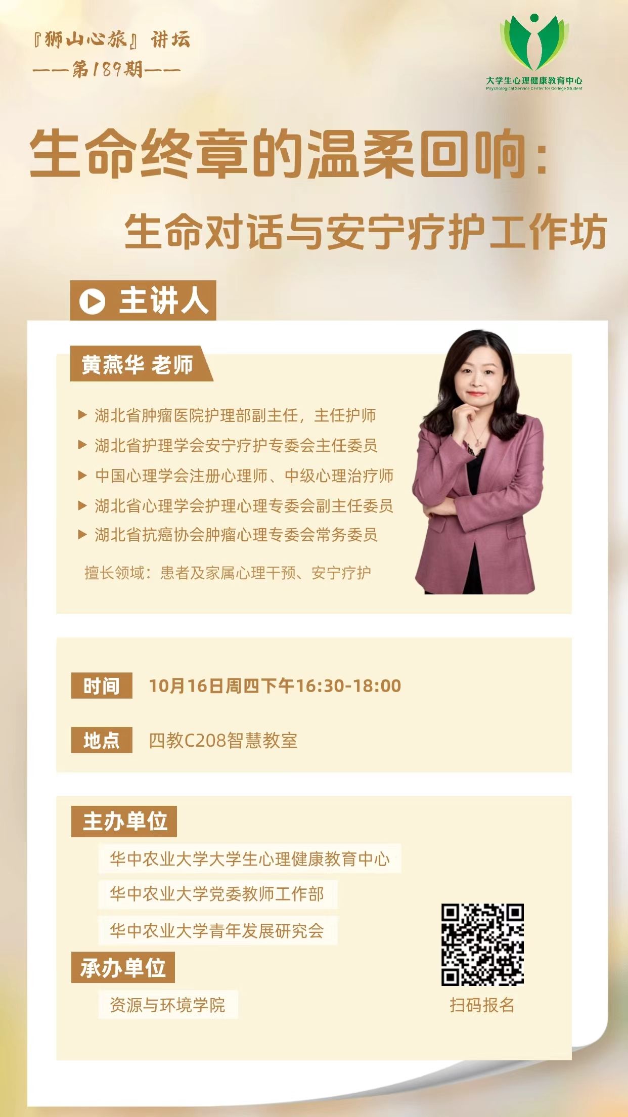 第189期“狮山心旅”系列心理讲坛:生命终章的温柔回响:生命对话与安宁疗护工作坊